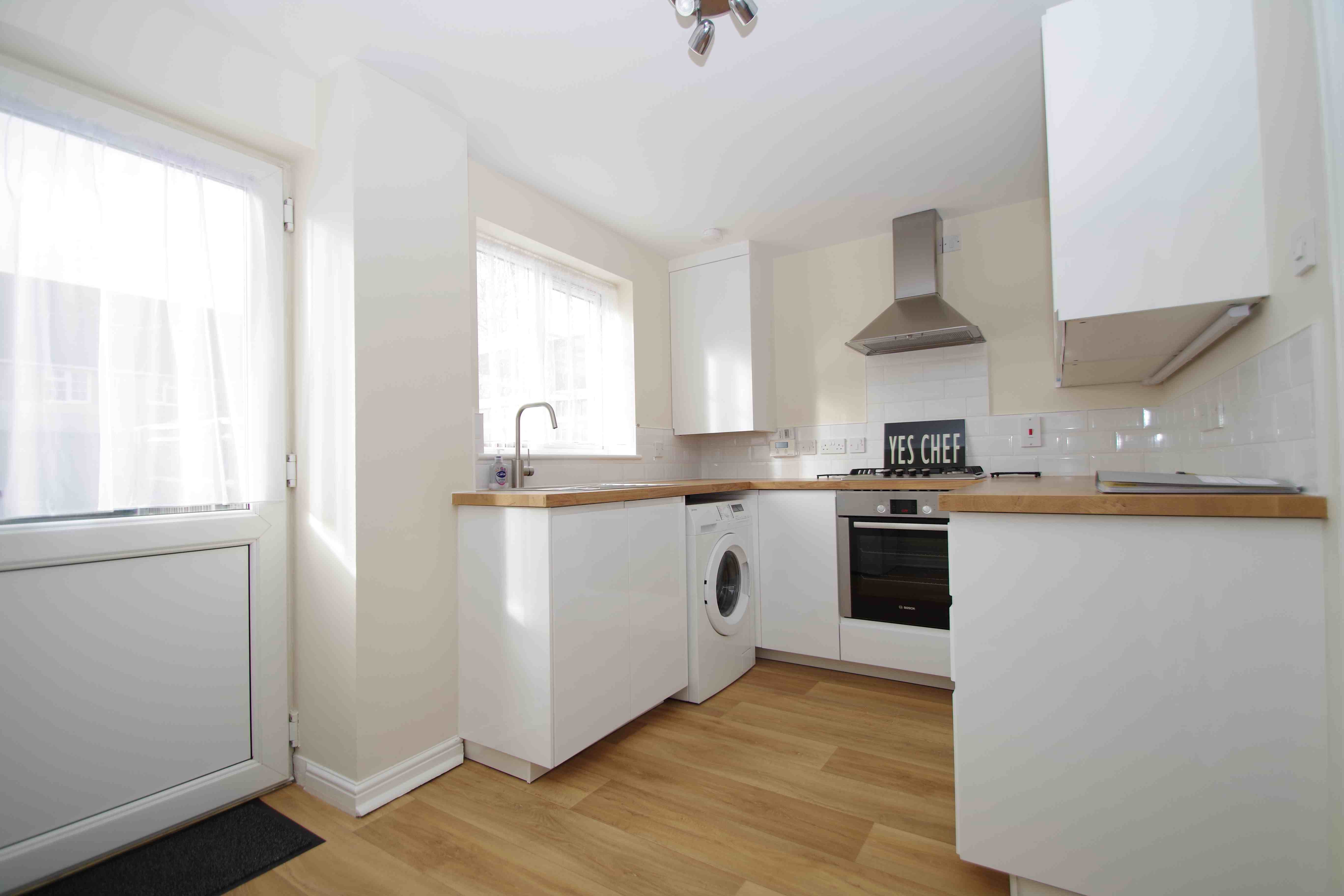 Brand new Kitchen / breakfast room fitted with electric oven, gas hob, fridge freezer and washing machine. Rear door to garden